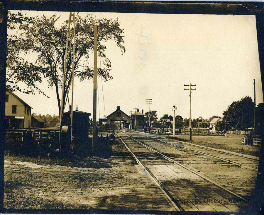 Copy of photo, showing station from Maine Street & Park Row, Shaw's and Peterson's store at left and (?)Gate Tandy's(?) house on the east side of Maine Street.