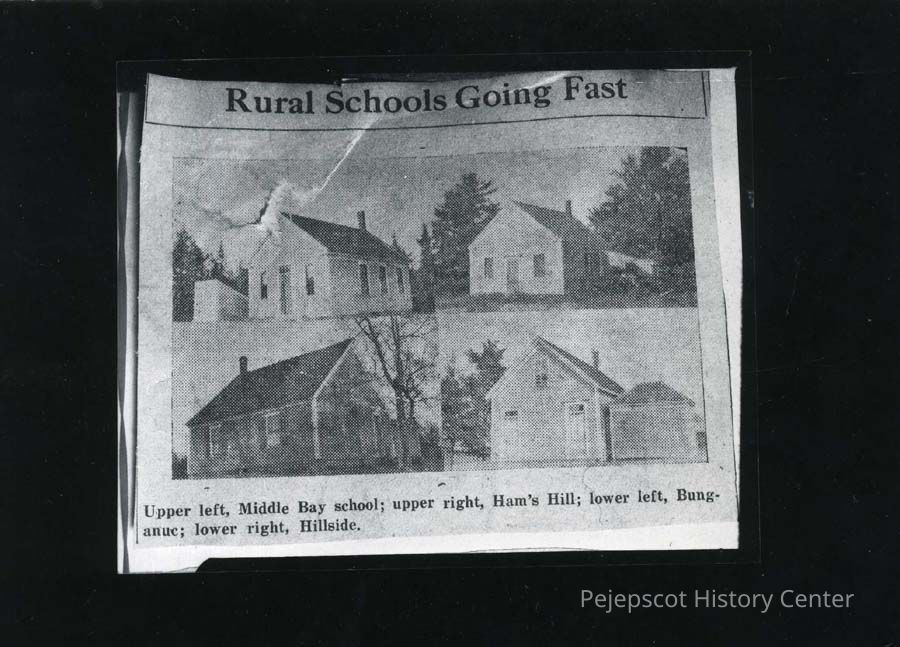 Black & white photograph from Brunswick Record news article about the demise of rural schools in the 1930s. Schools shown: Middle Bay School, Ham's Hill School, Bunganuc School, Hillside School.