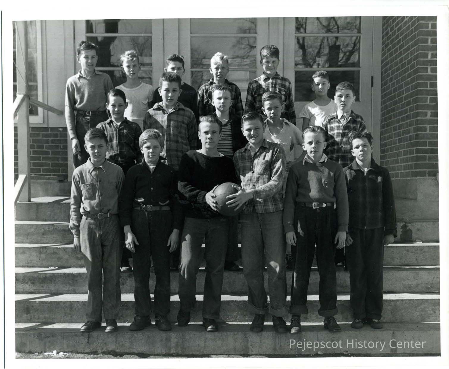 Three rows of boys stand on the steps of the Recreation Center in the early 1950s. The boys holding the basketball are Stan Munsey and Peter Smith. On the back left is Jim Walker and at the center left Bruce Austin. Undated