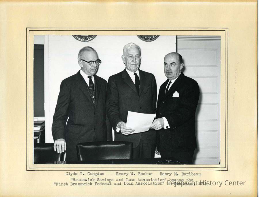 Black & white photograph of 3 men holding a document. Typed on front of matte reads: Clyde Congdon, Emery Booker, Henry Baribeau, Brunswick Savings & Loan Assn which became the First Brunswick Federal & Loan Assn. December 1965.Collection