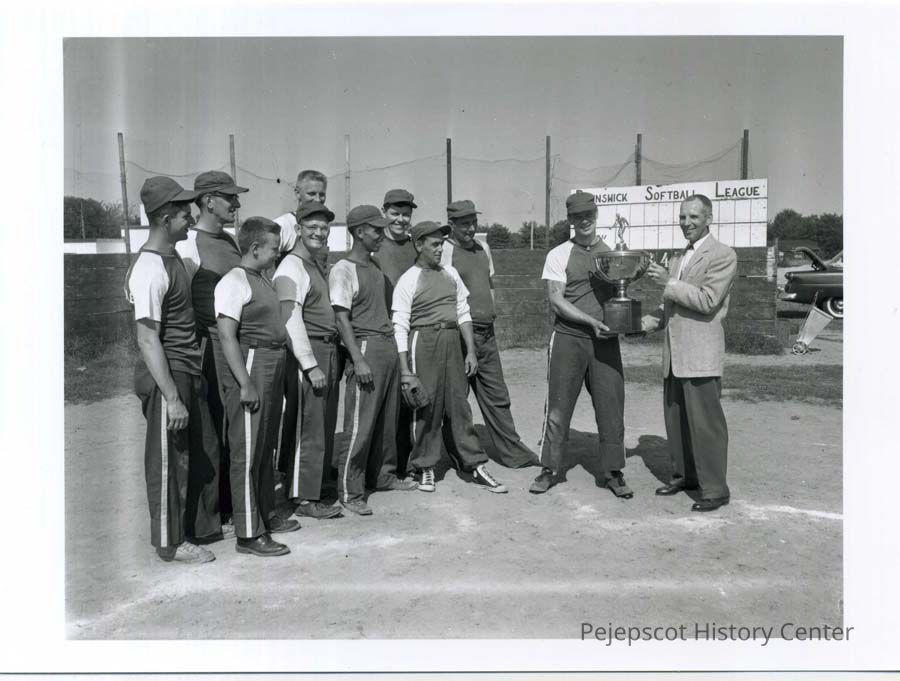 B/W photo of 10 members of the Brunswick softball team. One is being awarded a trophy.