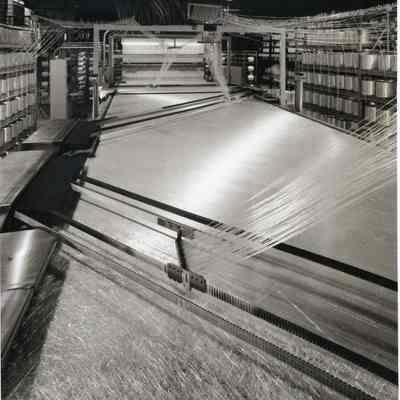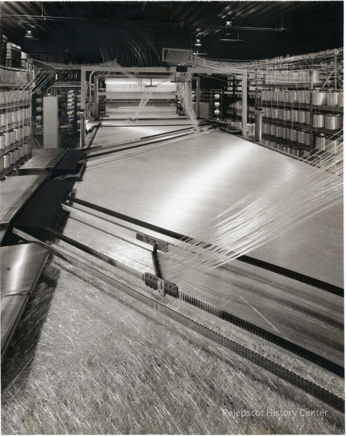 B/W photo of a machine at Brunswick technologies, a composite manufacturer located at the Industrial Park, Brunswick, ME. The photo shows strands of glittering fiberglass being fed into the machine. No date.