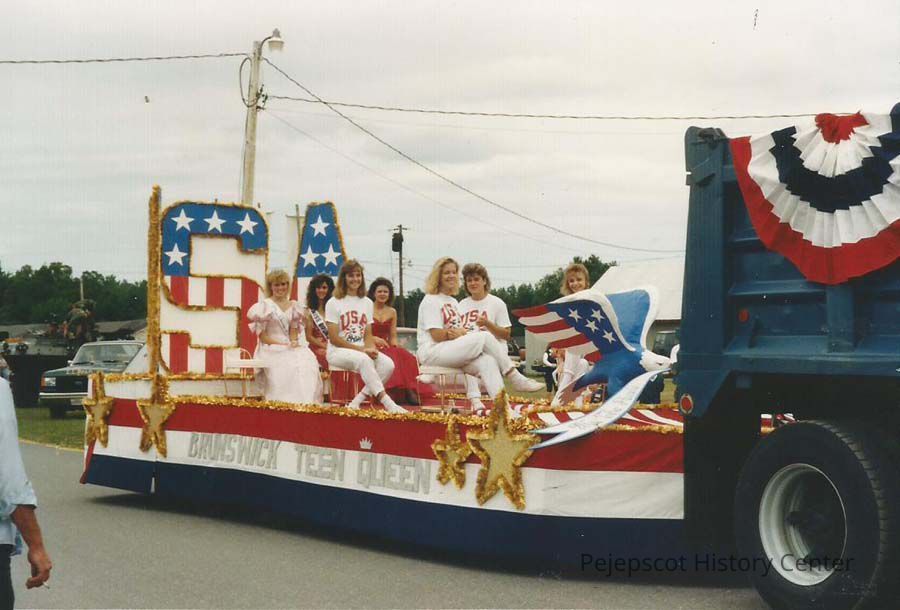 A color photograph of the Brunswick Teen Queen float in the Topsham Welcome Parade for the Persian Gulf Troops. Sitting in it are Darby Labbe, Cindy Pomerleau, Robin Moody, Heather Wilkes, Stacy Bean, Jodie Labrie and Corrie Pottle.