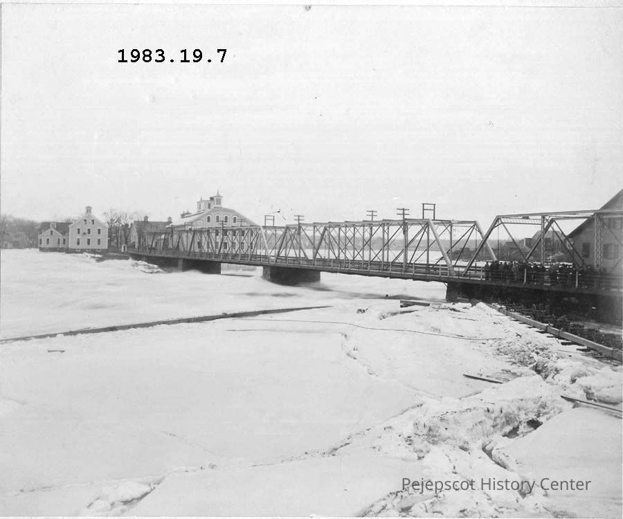 A B/W photograph of the Brunswick Topsham Bridge across Mill Island. There is a large group of people on the Brunswick end of the bridge. They appear to be looking at the ice in the river.