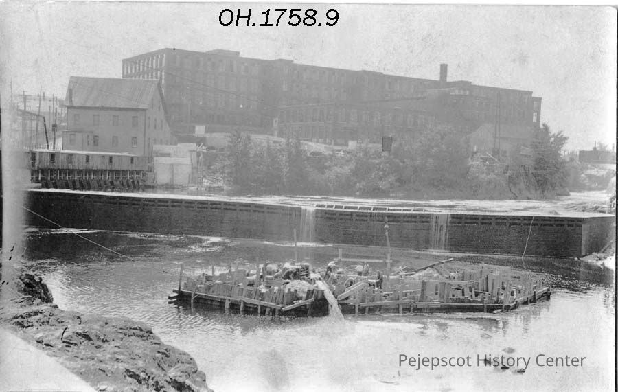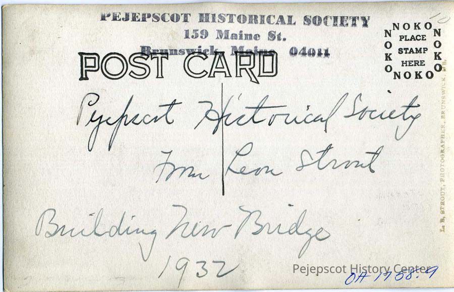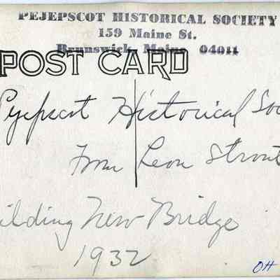 A B/W photograph of the construction of a new bridge across the Androscoggin River between Brunswick and Topsham, ME. The Cabot Mill can be seen in the background. 1932