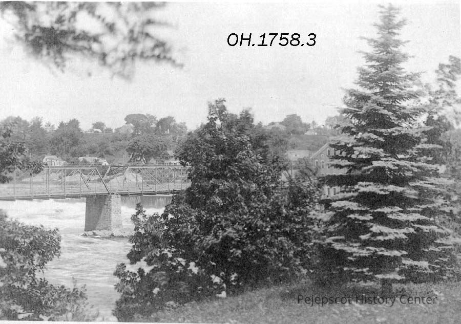 A B/W photograph of the Brunswick-Topsham Bridge, Brunswick, ME. It is looking upstream. Not dated.