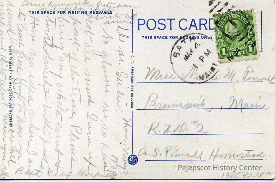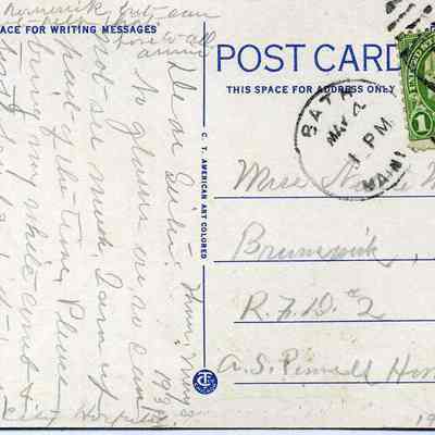 An undated colored postcard of the Brunswick-Topsham Bridge over the Androscoggin River with the Bowdoin Paper Mill behind it. The view is from Brunswick looking towards Topsham. The postcard is addressed to Miss Nellie M. Pennell of the A. S. Pennell Homestead in Brunswick, has a $0.01 cancelled postage stamp and was postmarked Bath, Maine on May 4 (no year). See accompanying photo for the message to the recipient on the back.Collection