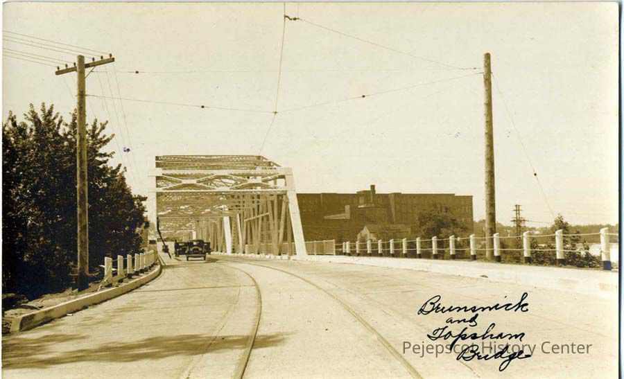 An undated sepia postcard of the Brunswick - Topsham bridge, as seen from the Topsham, Maine side, with the Cabot Mill in the background.Lexicon