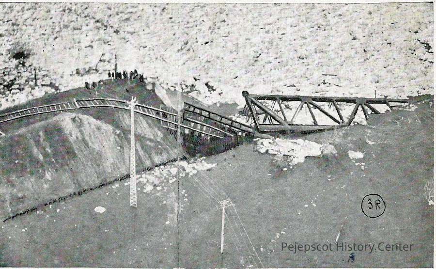 A B/W aerial picture postcard of the washed out Brunswick/Topsham Railroad bridge after the 1936 flood.