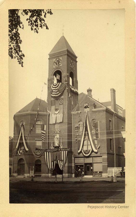 A B/W photo of old Brunswick Town Hall on Maine Street decorated for the town's 150th Anniversary celebration (sesquicentennial), June 13, 1889.