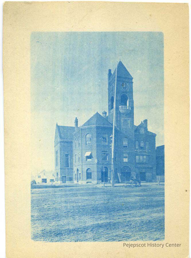 Photograph in blue finish of Brunswick's old Town Hall on Maine Street.