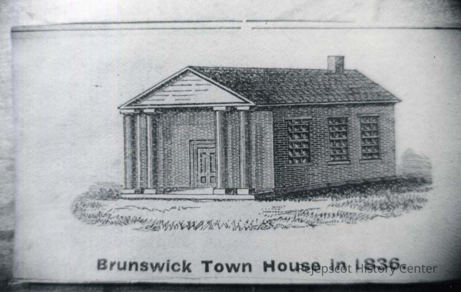 B/W photo of a drawing of the Brunswick Town House on upper Maine Street, Brunswick, ME. 1836.Collection