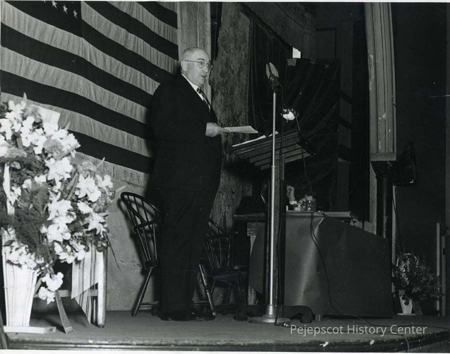 A B/W photograph of a man speaking at a Brunswick Town Meeting. Unverified: Possibly Edward W. Wheeler.