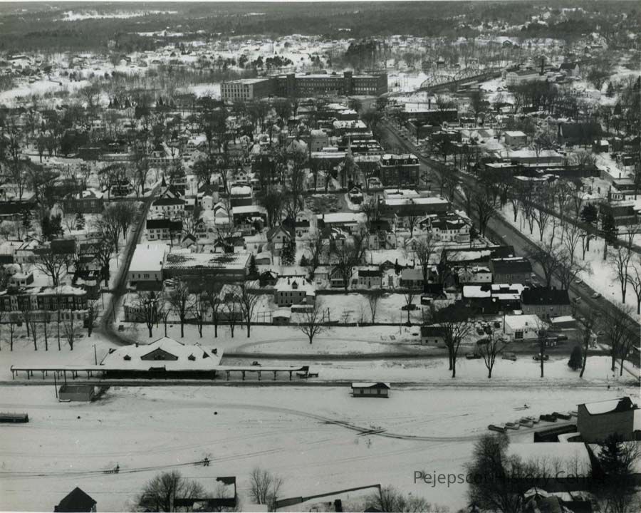 A B/W aerial photograph of the Brunswick Train Station, Maine Street and the Mall in Brunswick, ME. Undated.
