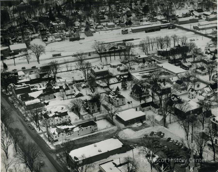 A B/W aerial photograph of the Brunswick Train Station and the Eagle Hotel, Brunswick, ME. Undated.