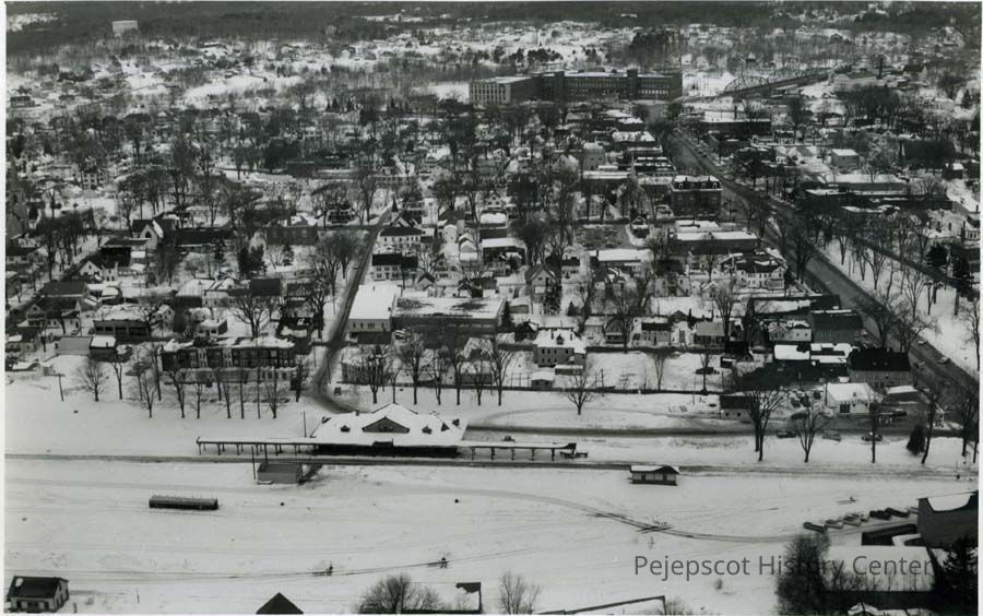 A B/W aerial photograph of the Brunswick Train Station, Maine Street, the Mall and the Eagle Hotel in the snow. Much of downtown Brunswick, ME, is visible. Undated.