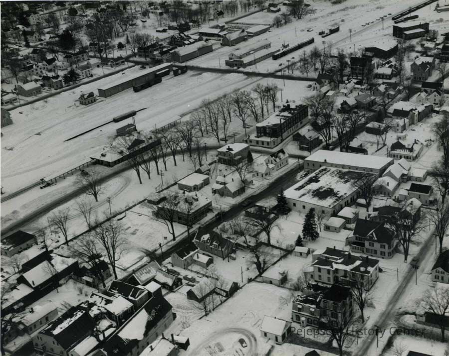 A B/W aerial photograph of the Brunswick Train Station and Eagle Hotel, Brunswick, ME. Undated.