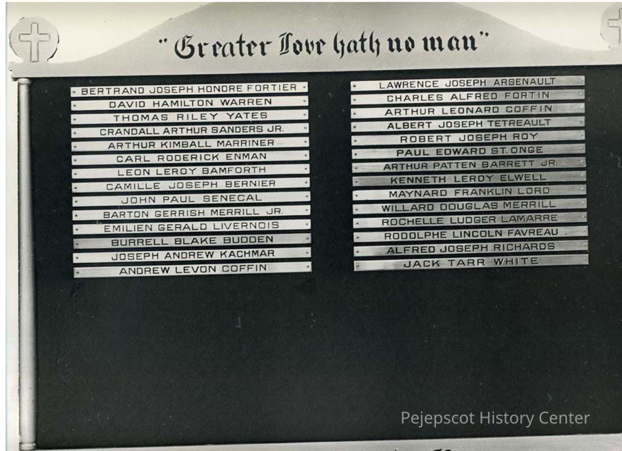 B/W photo of Brunswick, ME, Roll of Honor for WW II veterans. No date.