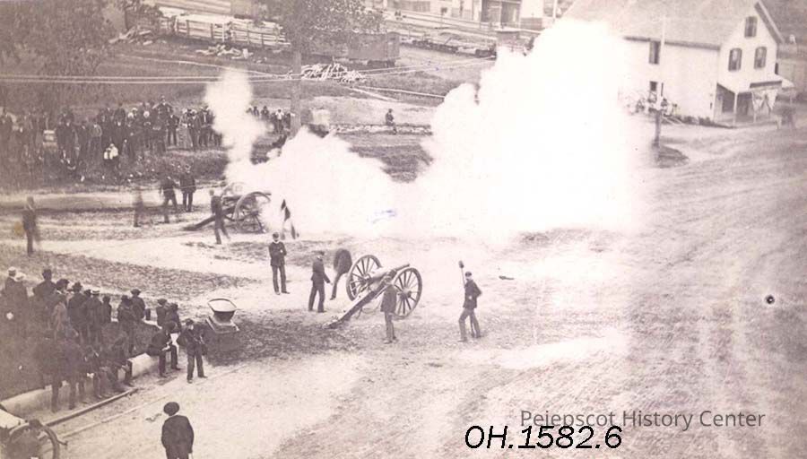 The firing of two cannons on Maine Street just south of the railroad track in celebration of Brunswick's (Maine) 150th Anniversary in 1889. Undated