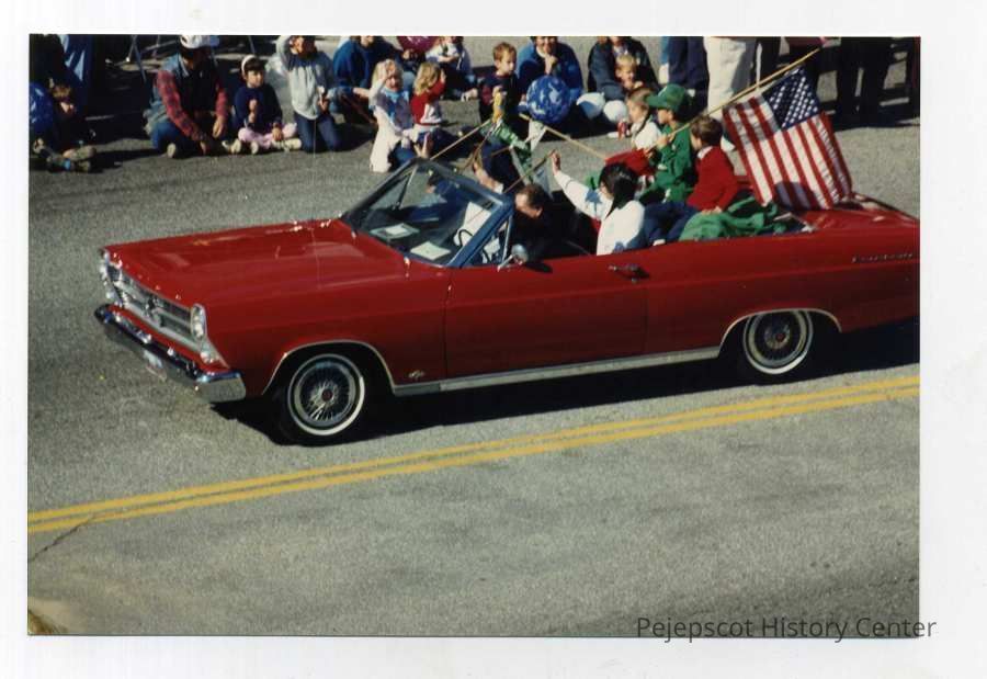 A color photo of Brunswick's 250th anniversary parade. The photo shows six people riding in an antique red convertible. 10/07/1989