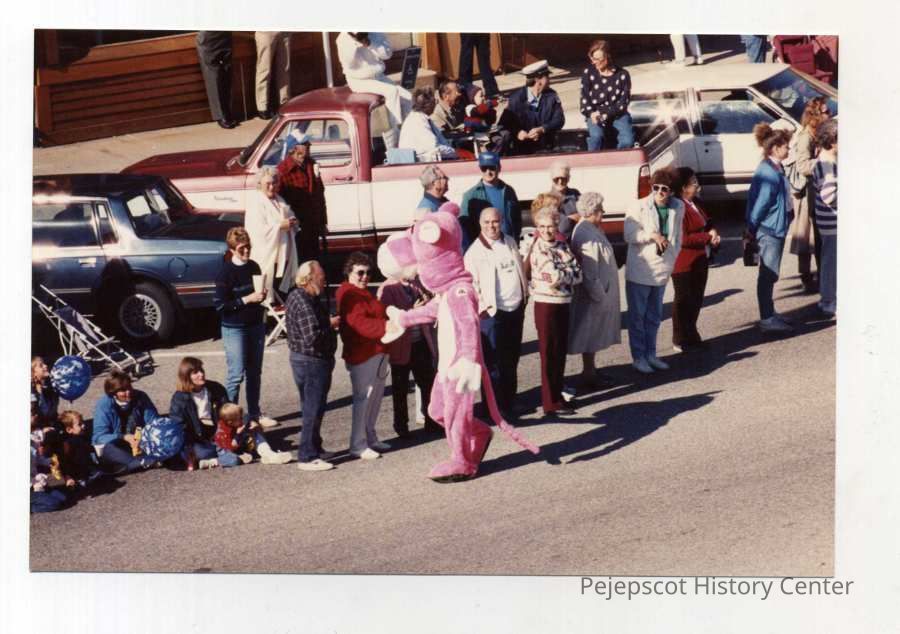 A color photo of Brunswick's 250th anniversary parade. The photo shows someone dressed in a Pink Panther costume interacting with members of the crowd. 10/07/1989