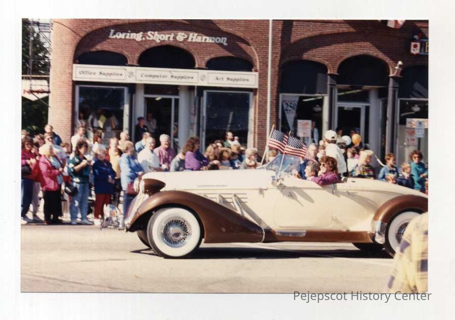 A color photo of Brunswick's 250th anniversary parade. The photo shows an antique tan and brown convertible driving down Maine Street. 10/07/1989