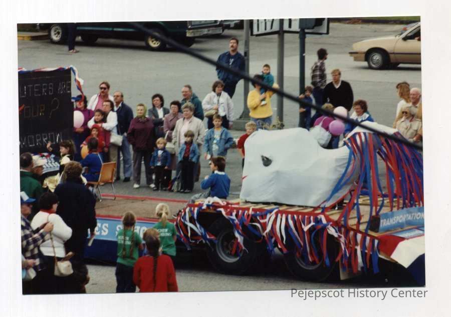 A color photo of Brunswick's 250th anniversary parade. The photo shows a float with several children on it and what appears to be a whale on the back. 10/07/1989