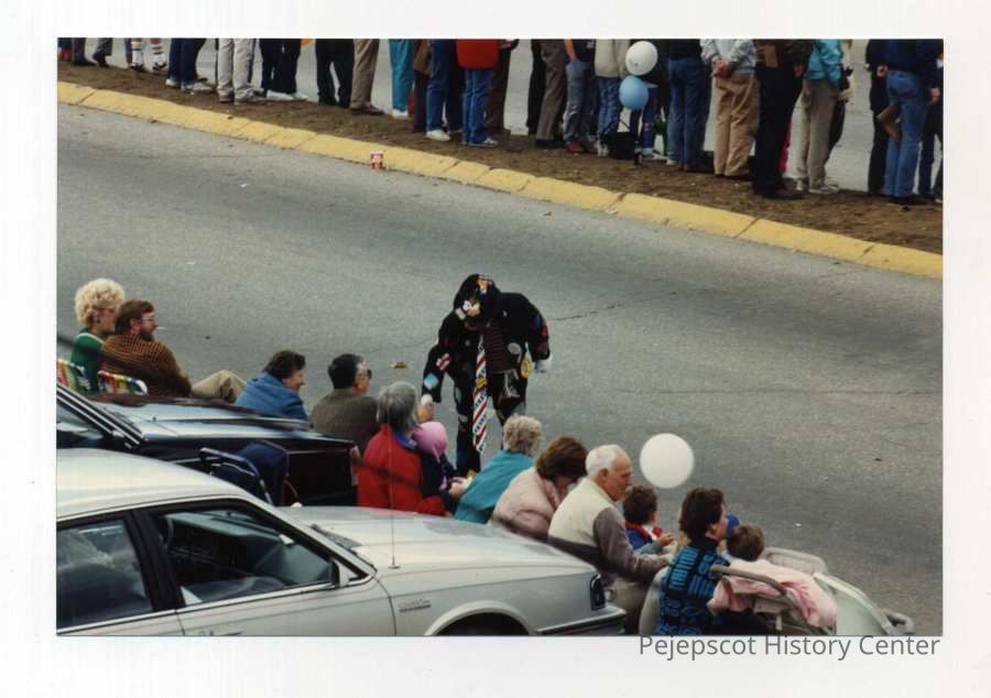 A color photo of Brunswick's 250th anniversary parade. The photo shows a man in a jacket, pants, and hat all decorated with various patches and other things, interacting with the crowd on the side of the road. 10/07/1989
