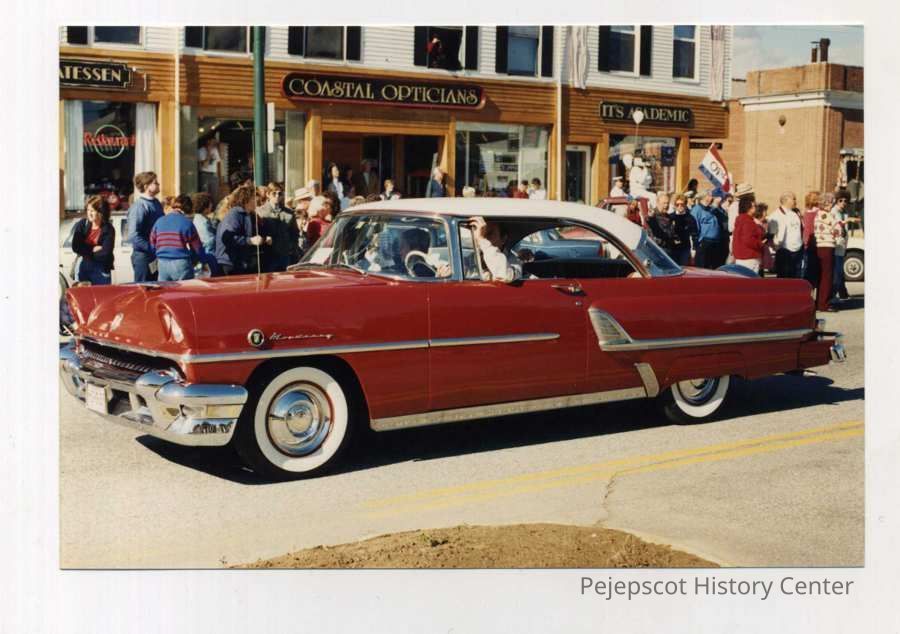 A color photo of Brunswick's 250th anniversary parade. The photo shows an antique red Mercury car driving down Maine Street as the crowd looks on. 10/07/1989