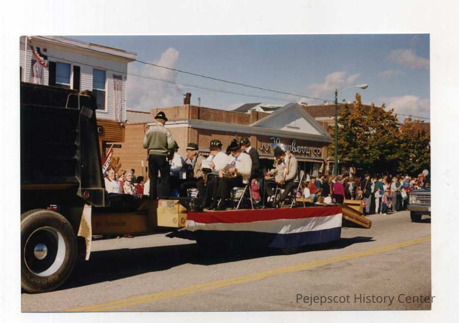 A color photo of Brunswick's 250th anniversary parade. The photo shows a float on which a small band is sitting. 10/07/1989