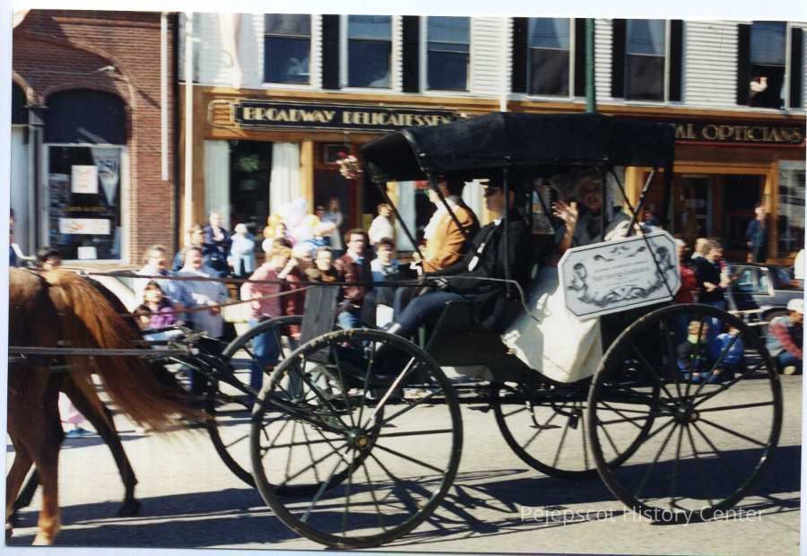 250 Years a Town, 250th Anniversary - Brunswick, 250th Anniversary Parade, Banks, Banks - Bath, Bath Savings Institution, Horse, Horse and Carriage, Horse and Wagon, Horse Wagon, Horses, Maine Street, Maine Street, Brunswick, Maine Street - Brunswick, Parade, Parades, Parades - Brunswick, Streets - Maine, Streets - Maine Street