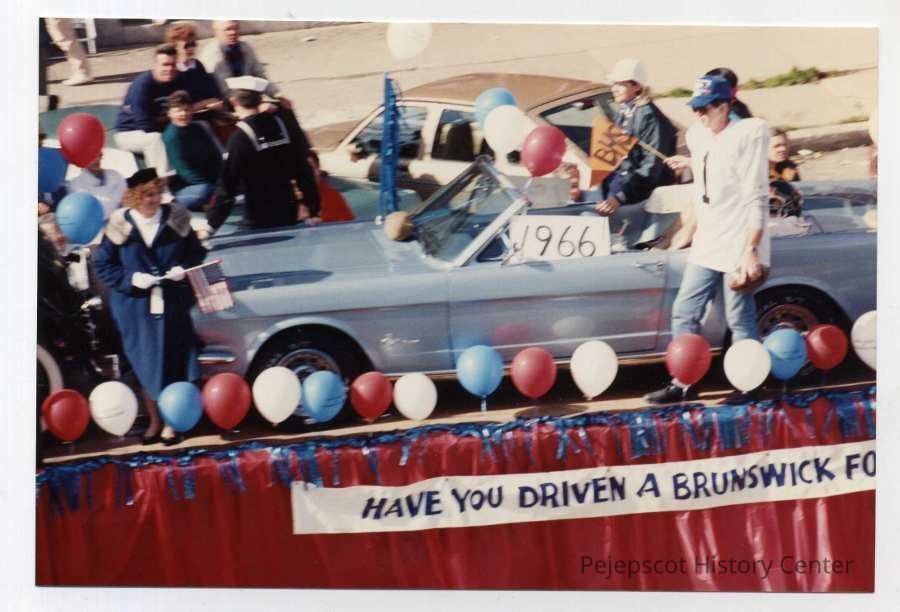 A color photo of Brunswick's 250th anniversary parade. A 1966 Ford car is shown, along with multiple spectators, and a football player. The banner in the foreground of the photo says "have you driven a Brunswick Ford today." 10/07/1989Collection
