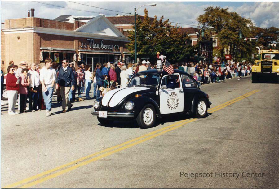 A color photo of Brunswick's 250th anniversary parade. The photo shows a Kora Shriner's Crazy Cops car in front of JJ Newberry's store on Maine Street. 10/07/1989