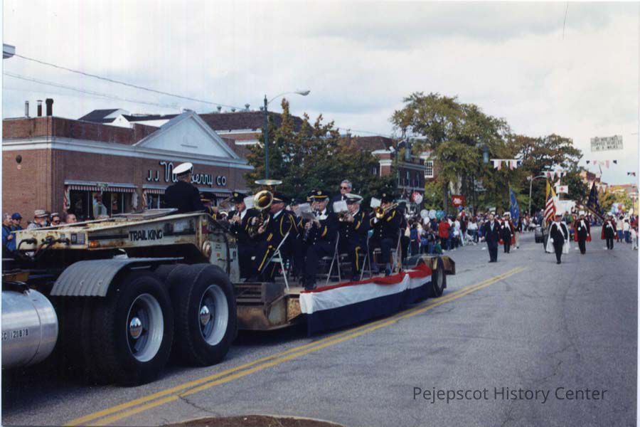 A color photo of Brunswick's 250th anniversary parade. The photo shows a Navy Band riding on a trailer. They are in front of the JJ Newberry's store on Maine Street. 10/07/1989