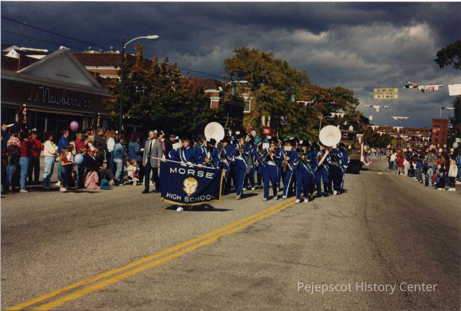A color photo of Brunswick's 250th anniversary parade. The photo shows the Morse High School marching band. They are in front of the JJ Newberry Company store on Maine Street. 10/07/1989