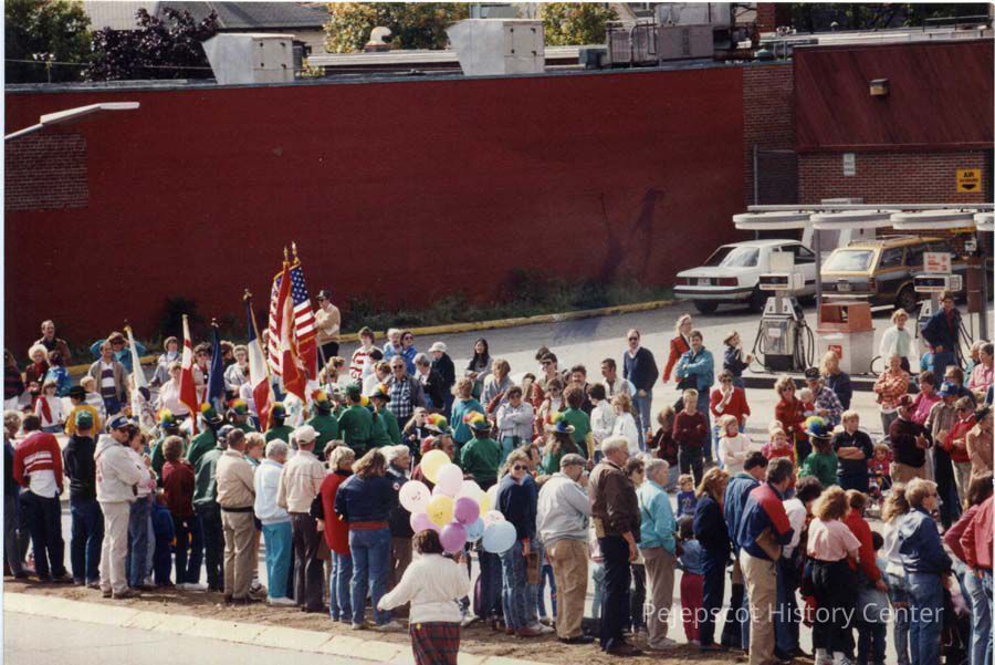 A color photo of Brunswick's 250th anniversary parade. The photo shows people lined up on Maine Street watching the parade. 10/07/1989