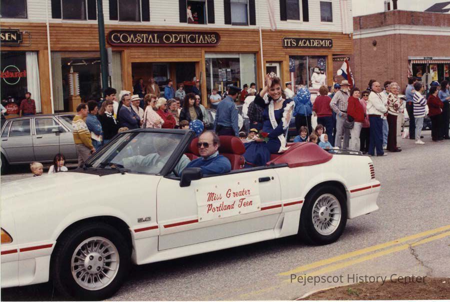 A color photo of Brunswick's 250th anniversary parade. The photo shows a car carrying the Miss Greater Portland Teen on Maine Street in front of Coastal Opticians. 10/07/1989