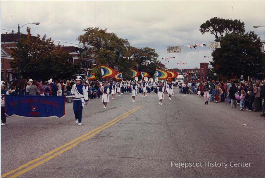 A color photo of Brunswick's 250th anniversary parade. The photo shows the Mt. Ararat Marching Band on Maine Street. 10/07/1989