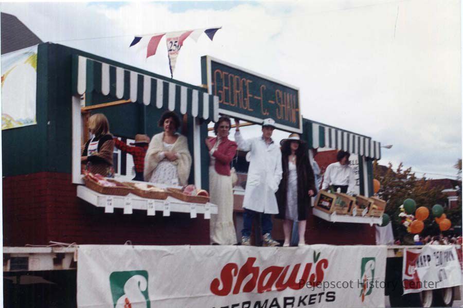 A color photo of Brunswick's 250th anniversary parade. The photo shows the Shaw's Supermarket float on Maine Street. 10/07/1989
