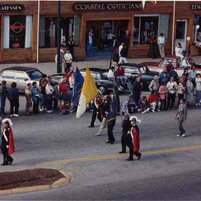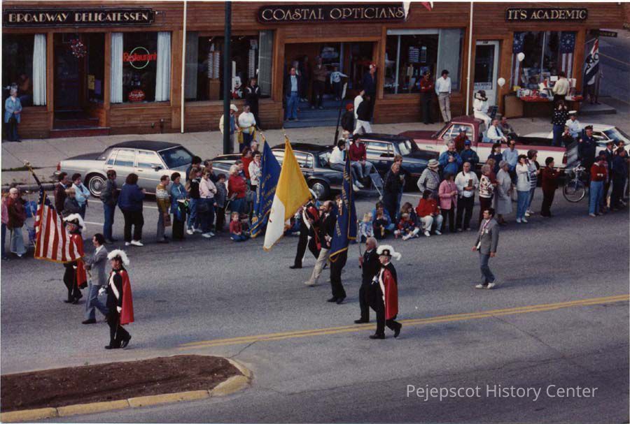 A color photo of Brunswick's 250th anniversary parade. The photo shows several men in feathered hats and capes, as well as other men in blazers carrying four flags. One flag is the American flag, and two are navy colored with gold writing which is hard to read in the photograph. 10/07/1989Collection