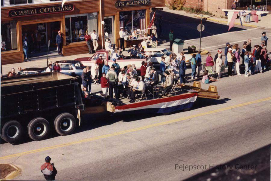A color photo of Brunswick's 250th anniversary parade. The photo shows a trailer with a small band on it on Maine Street in front of It's Academic. 10/07/1989