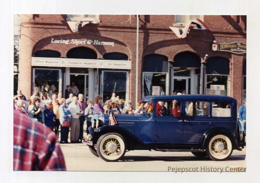 A color photo of Brunswick's 250th anniversary parade. The photo shows a blue antique car driving down Maine Street. 10/07/1989 Woman in blue jacket is Mary O'Donnell. Gordon O'Donnell is beside her.