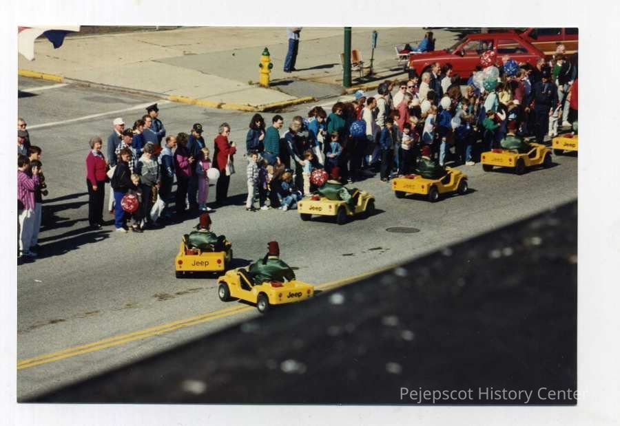 A color photo of Brunswick's 250th anniversary parade. The photo shows six people in green jackets and red hats (Kora Shriners) driving yellow Midget Jeeps 10/07/1989