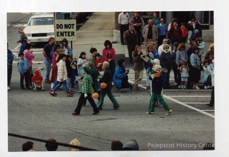 A color photo of Brunswick's 250th anniversary parade. The photo shows five older women dressed in green and carrying orange balloons. 10/07/1989 These women were the "Evergreens", the first senior citizens group in Brunswick.