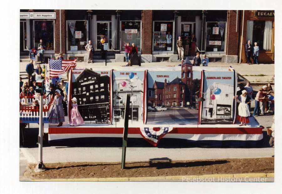 250 Years a Town, 250th Anniversary - Brunswick, 250th Anniversary Parade, Cumberland Theater, Cumberland Theatre, Dunlap Block, Float, Floats, Maine Street, Maine Street - Brunswick, Maine Street, Brunswick, Old Town Building, Old Town Hall, Parade, Parades, Parades - Brunswick, Streets - Maine, Streets - Maine Street, The Bowdoin