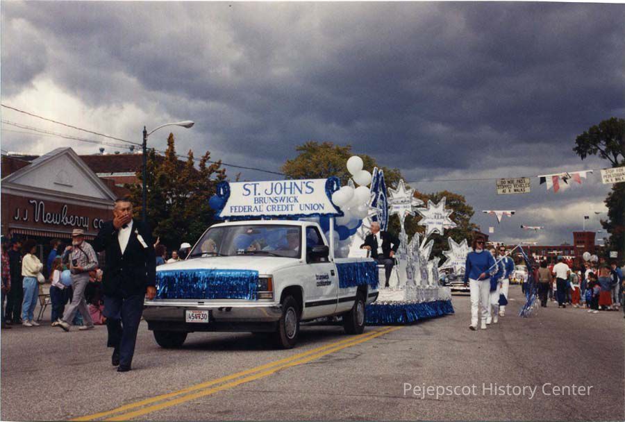 A color photo of Brunswick's 250th anniversary parade. The photo shows the St. John's Federal Credit Union float on Maine Street in front of JJ Newberry's store. 10/07/1989