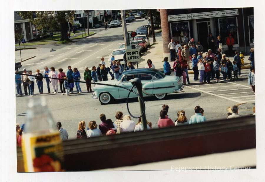 A color photo of Brunswick's 250th anniversary parade. The photo shows a teal blue colored old fashioned car driving down Maine Street. 10/07/1989