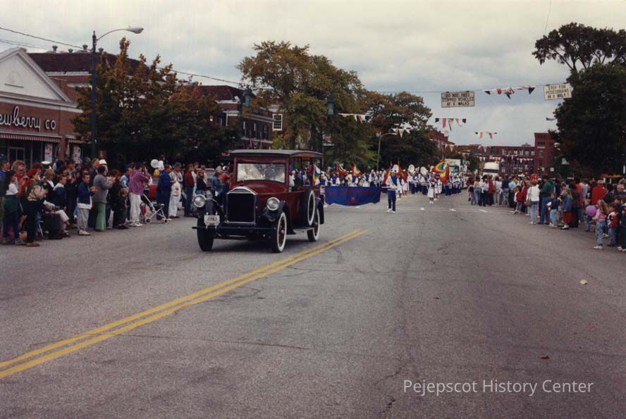 A color photo of the parade heading south with J. J. Newberry's & Senters in the background showing an old car with the Mt. Ararat band following. 10/07/1989