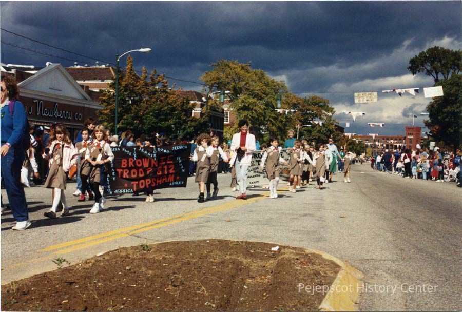 A color photo of Brunswick's 250th anniversary parade. The photo shows the Brownie Scout marching unit from Topsham. They are on Maine Street in front of JJ Newberry Store. 10/07/1989