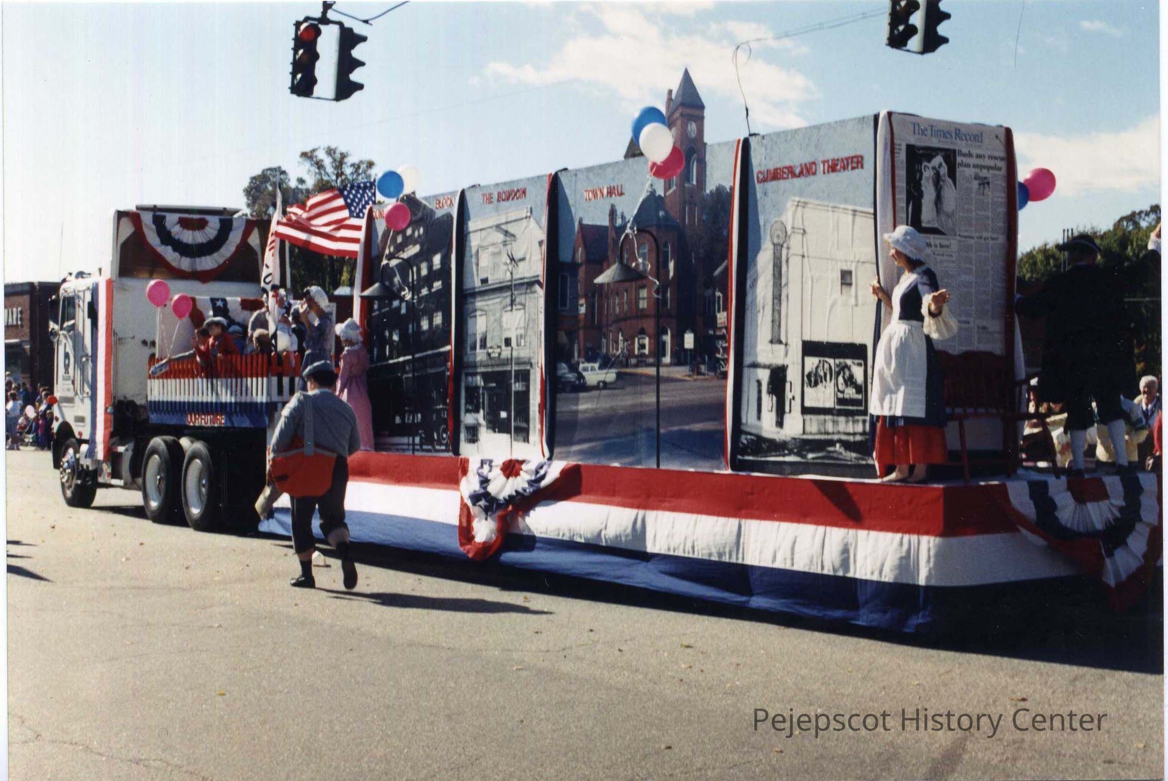 A color photo of Brunswick's 250th anniversary parade. The photo shows an unidentified float. This is the same float as in 1990.156.527.164. 10/07/1989